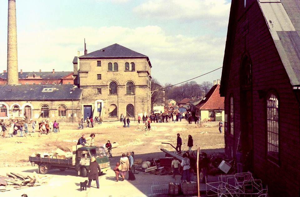Christiania. Til venstre Månefiskeren, i midten Fabrikken og til højre Den Grønne Hal
