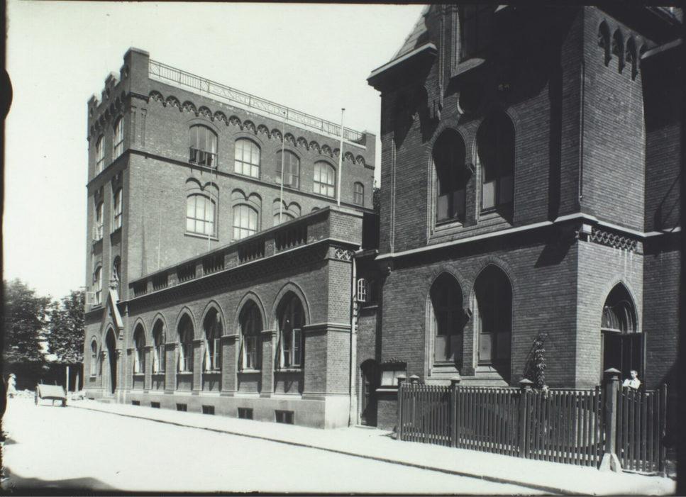Stenosgade. Sankt Knuds Skole og Jesu Hjerte Kirke