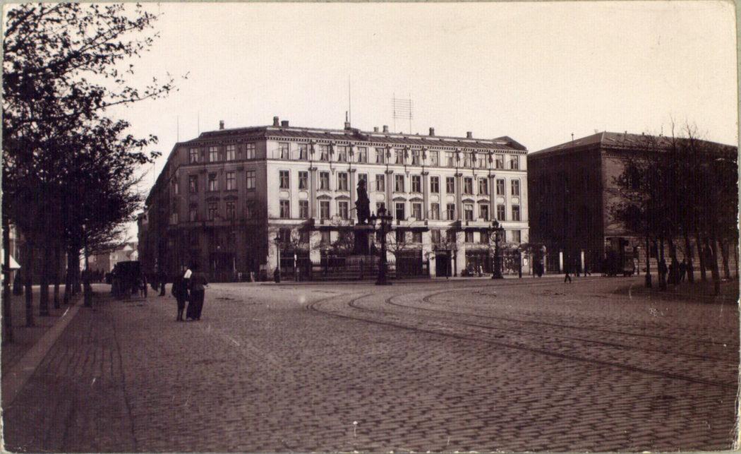 Holmens Kanal nr. 15 som Hotel Kongen af Danmark med statue af Niels Juel og Nationalbanken set mod Niels Juels Gade