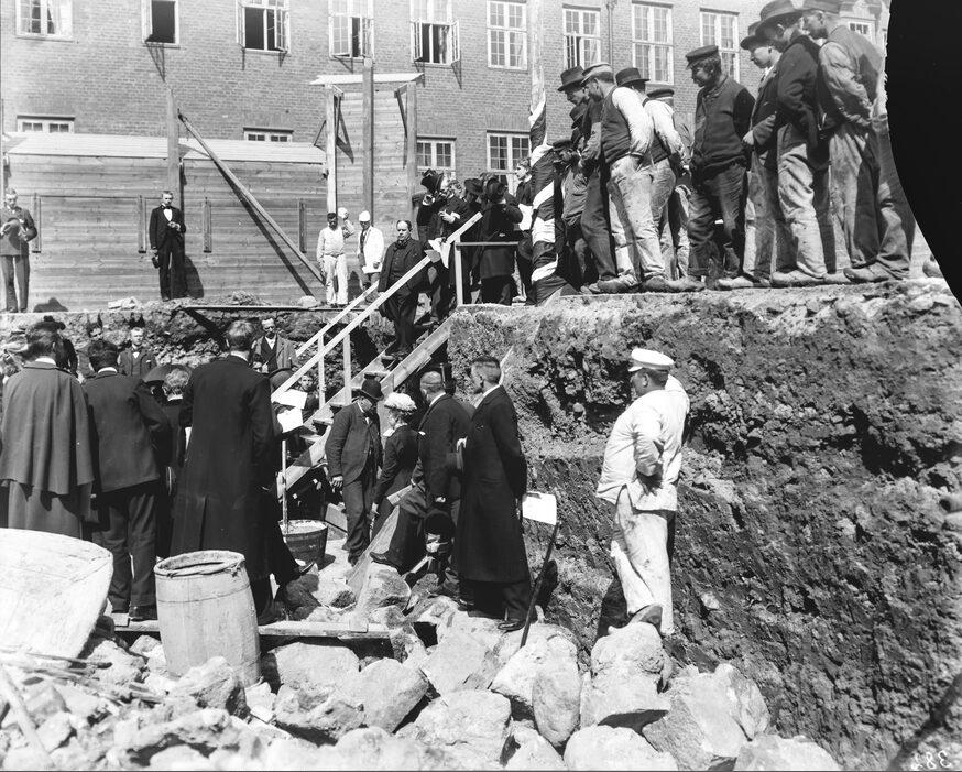 Hjørnet af Bispetorvet og Studiestræde. Grundstensnedlæggelsen for Studentersamfundets hus