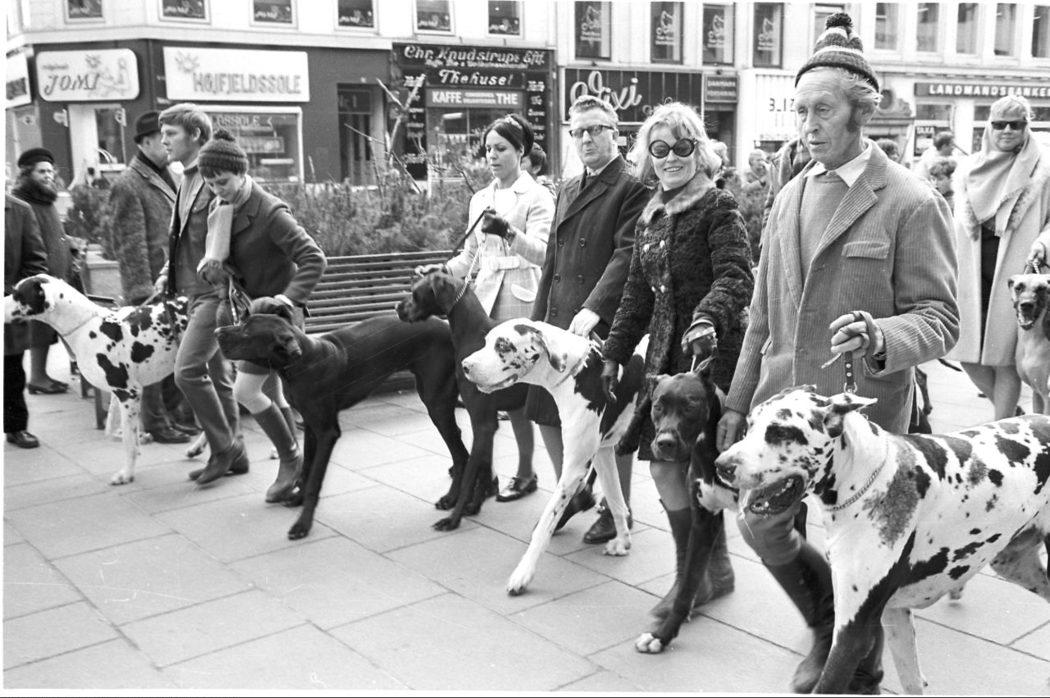Optog på Strøget, hundeejere og hunde reklamerer for Hundeudstilling i Bella Centret