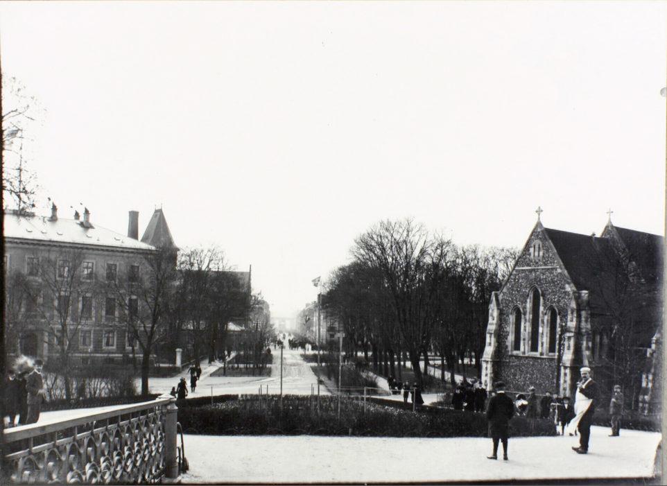 Anlægget ved St. Albans Kirke, set mod Amaliegade