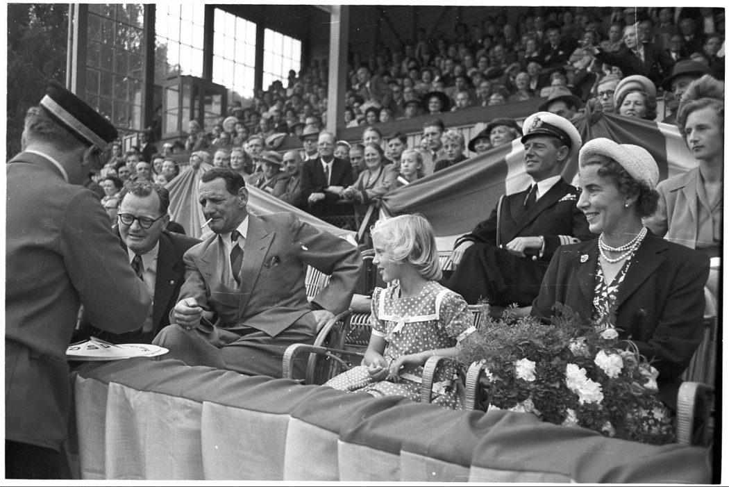 Fagenes Fest på Østerbro Stadion. Kong Frederik IX og Dronning Ingrid sammen med Prinsesse Margrethe