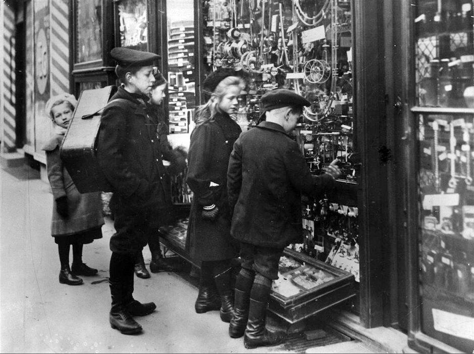 Børn kigger på legetøj i et vindue på Gammel Kongevej