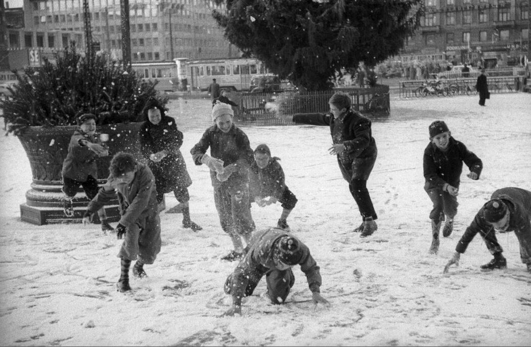 Rådhuspladsen. Den første julesne er faldet, så skal der kastes med snebolde
