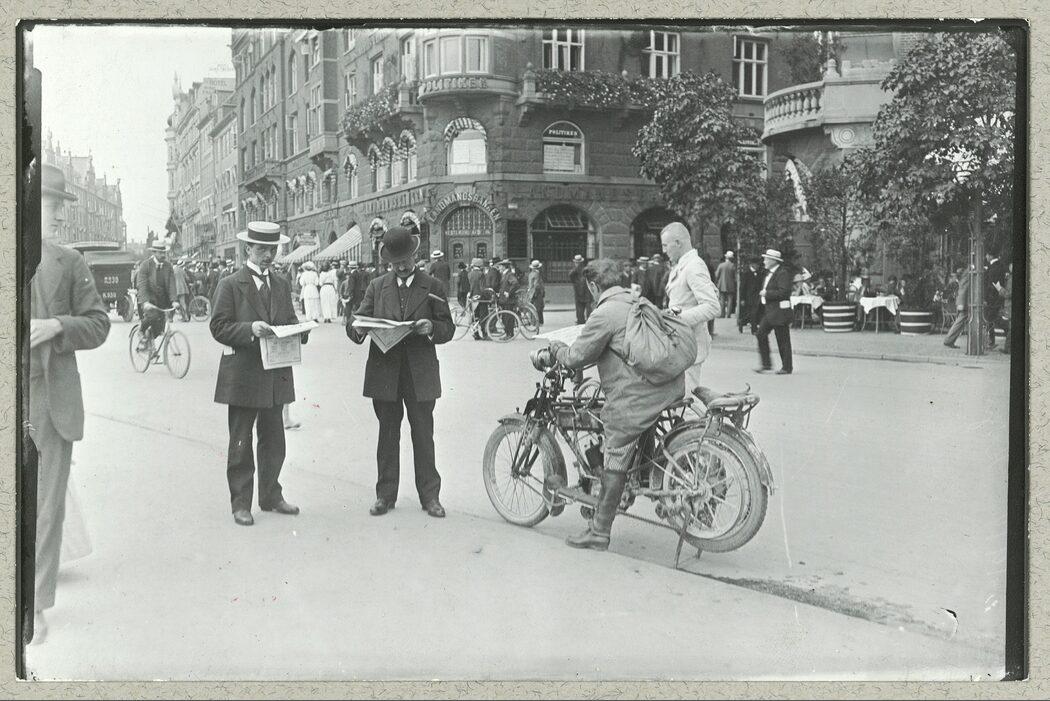 Rådhuspladsen. Krigen er erklæret. Folk på gaden underrettes om krigsudbruddet gennem aviserne