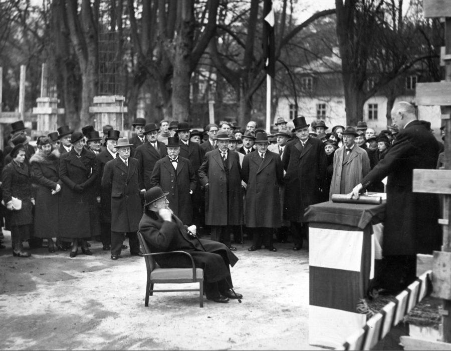 Statsminister Thorvald Stauning overværer grundstensnedlæggelses til Danmarks Akvarium i Charlottenlund