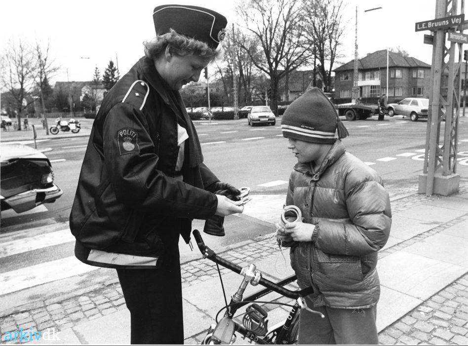 Bernstorffsvej /L. E. Bruuns Vej. Politibetjent demonstrerer håndjern for en interesseret dreng