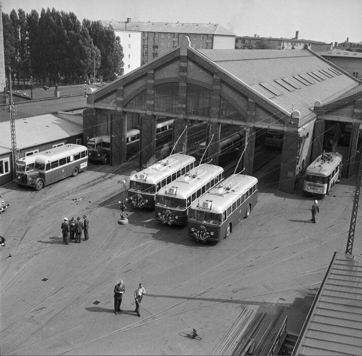Trolleybusser kører ud fra Remisen i Hellerup