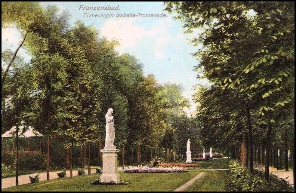 Františkovy Lázně. Pohled na sochy v promenádě