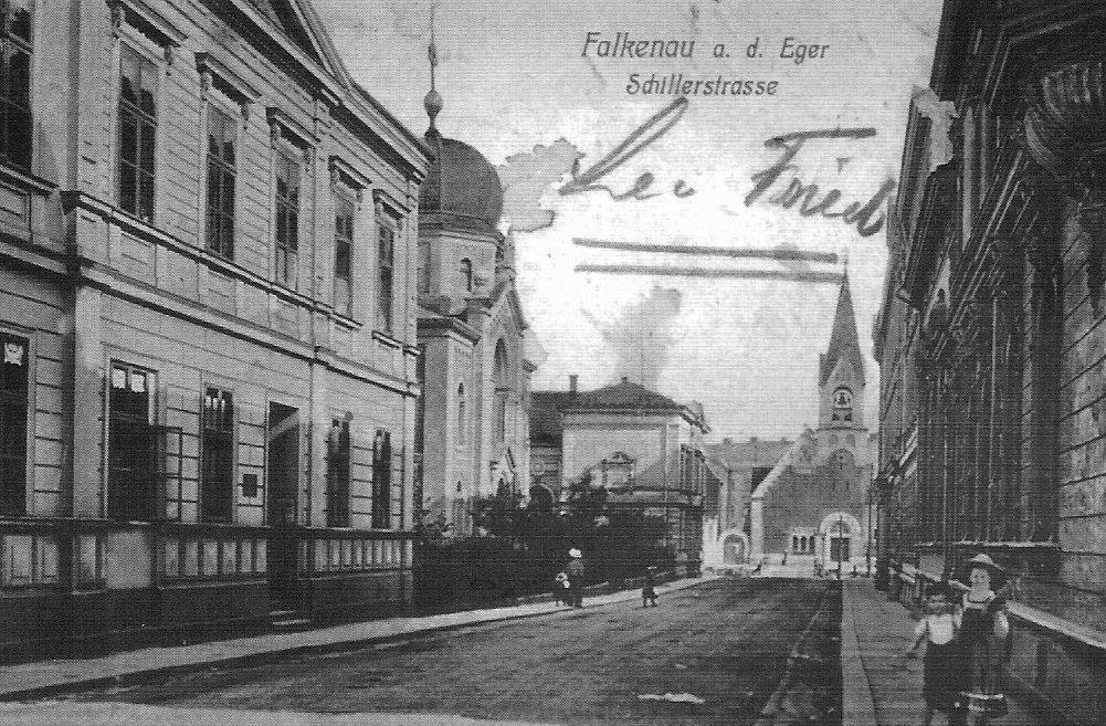 Sokolov, synagoga. Synagoga (vlevo) s ulicí