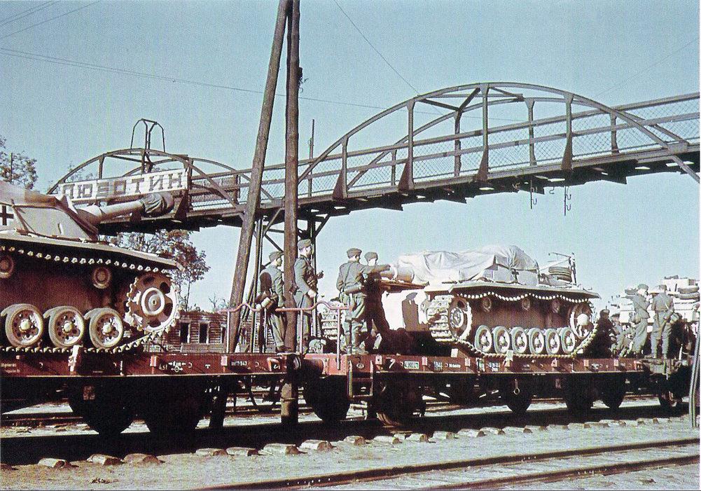 Состав с немецкой бронетехникой на железнодорожной станции станции Люботин