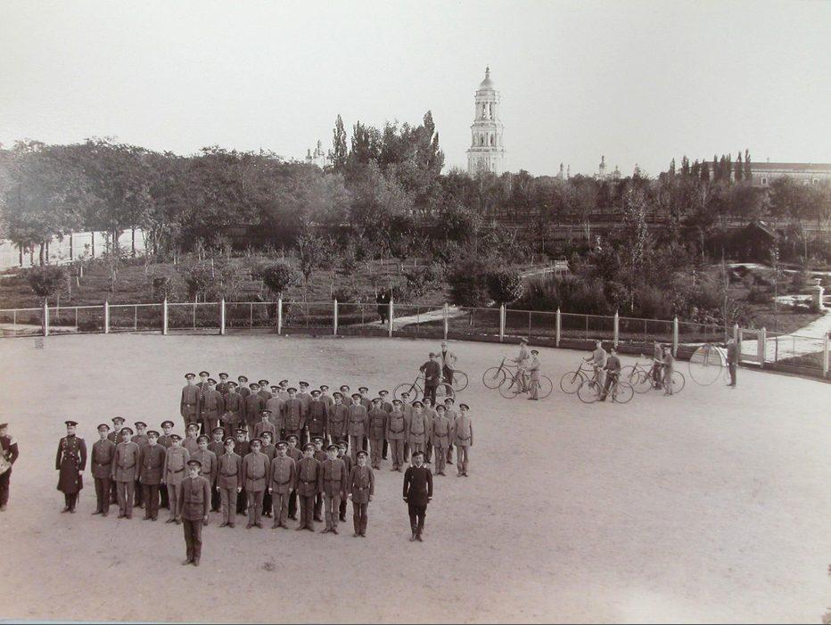 Группа гимназистов Киево-Печерской гимназии во время выполнения строевых упражнений