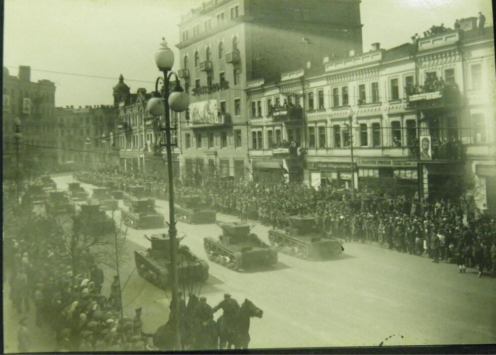 Парадная колона Т-26 проезжает по Красноармейской