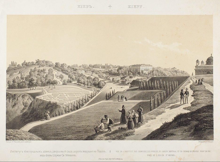 Институт благородных девиц, Дворцовый сад, дорога, ведущая на Подол, вид церкви Св. Михаила