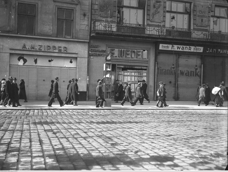 Zdemolowane wystawy sklepów na placu Mariackim