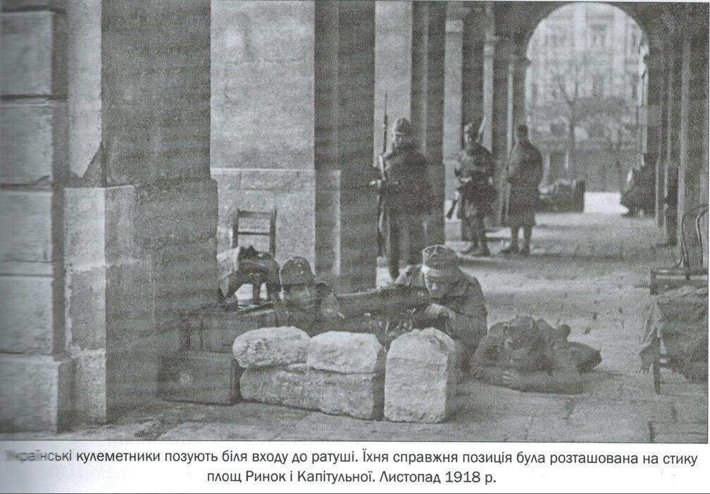 Украинские пулеметчики позируют возле входа в ратушу