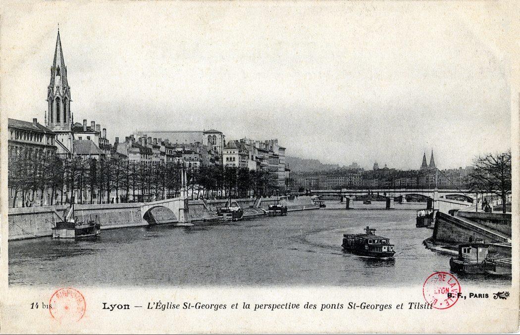 Lyon — L'Église Saint-Georges et la perspective des ponts Saint-Georges et Tilsitt