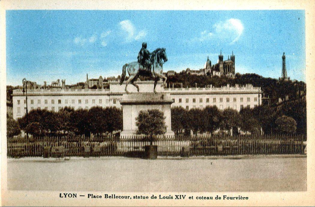 Lyon — Place Bellecour, statue de Louis XIV et coteau de Fourvière
