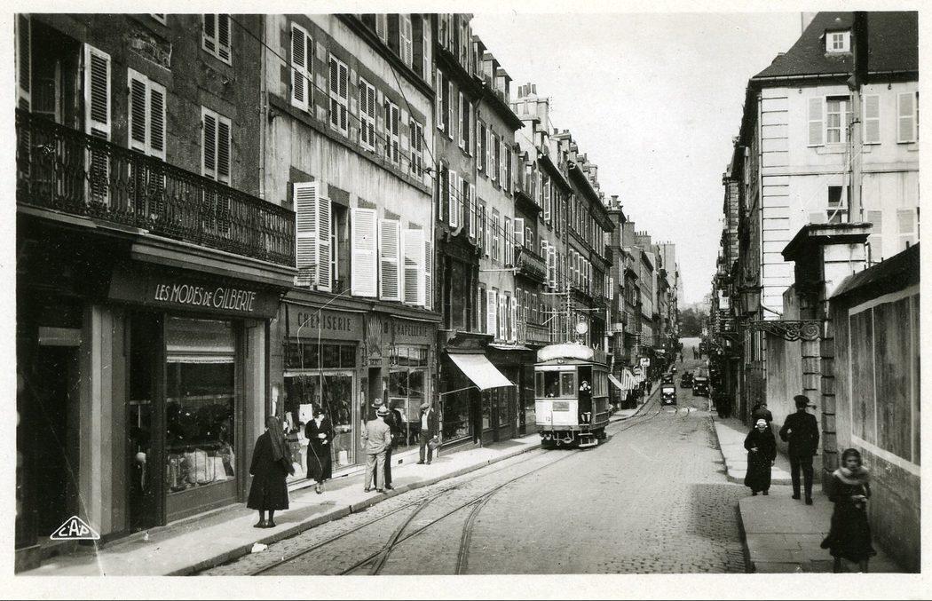 Rue de Siam : commerces, piétons, tramway. A droite l'entrée de la Préfecture Maritime