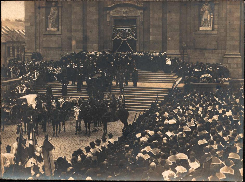 Accident du sous-marin "Lutin". Victimes, obsèques : vue des cercueils sur le parvis de l'église Saint-Louis