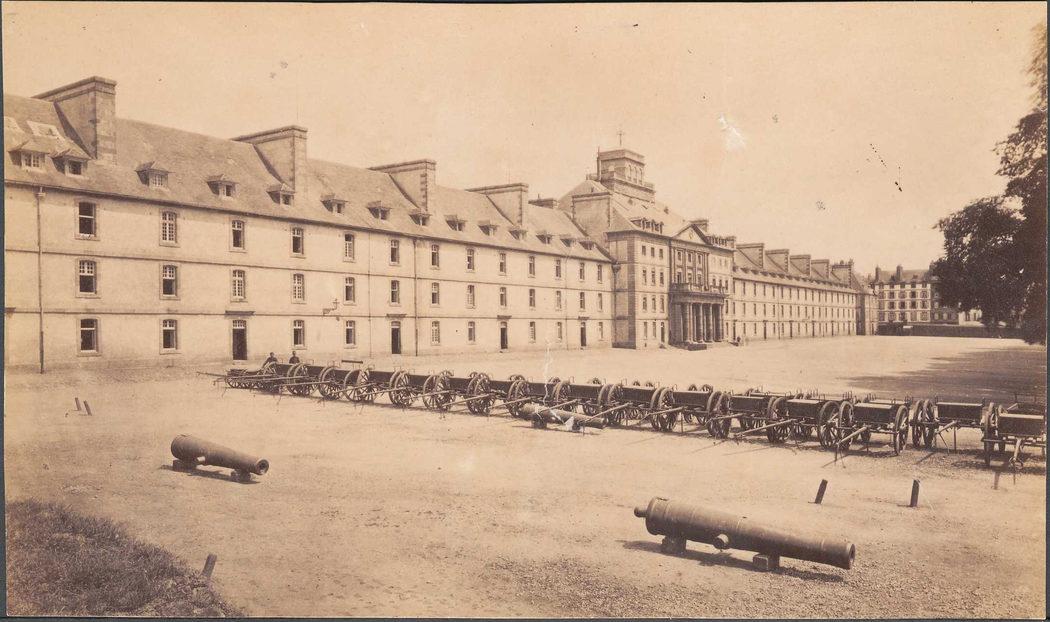 Caserne Fautras. Cour et Bâtiments : vue d'ensemble, au premier plan les canons