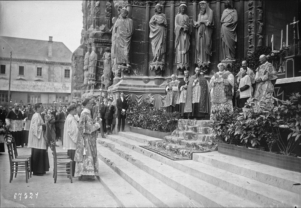 Reims. Retour de la statue de Jeanne d'Arc: cérémonie religieuse devant la cathédrale Notre-Dame