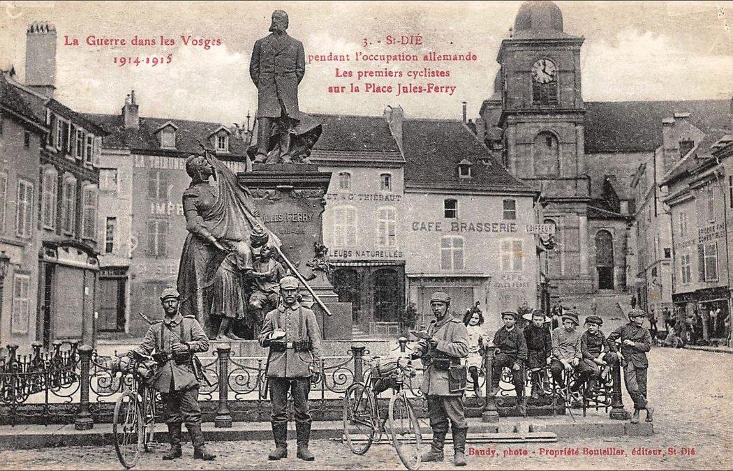 St-Dié pendant l'occupation allemande. Les premiers cyclistes sur la Place Jules-Ferry