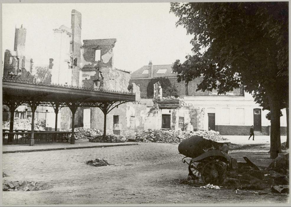 Place du Marché. Au fond, maisons bombardées ; au premier plan, à droite, automobile détruite par une bombe d'avion