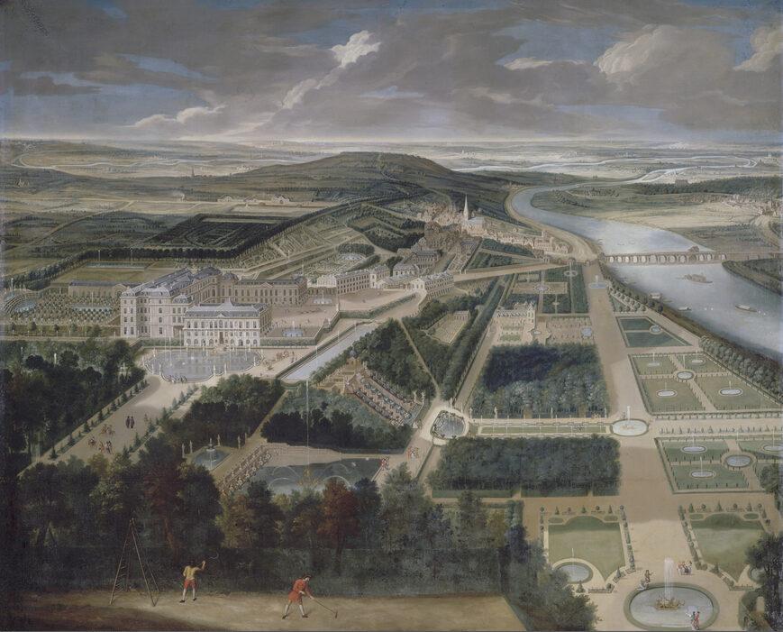 Vue cavalière du château, jardins bas et de la ville de Saint-Cloud