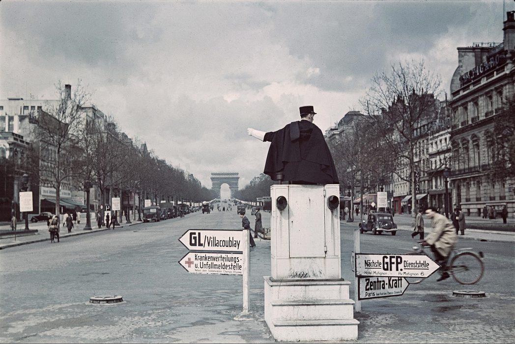 Agent de la circulation et signalisation allemande au Rond-Point des Champs-Elysées