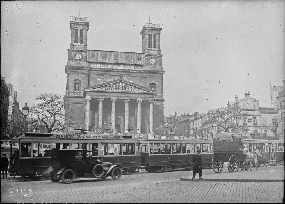 Le tramway, ligne 28, passe devant l'église Saint-Vincent-de-Paul