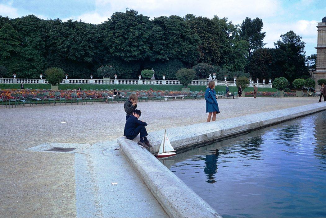 Un bassin du jardin du Luxembourg avec des enfants et un bateau à voile
