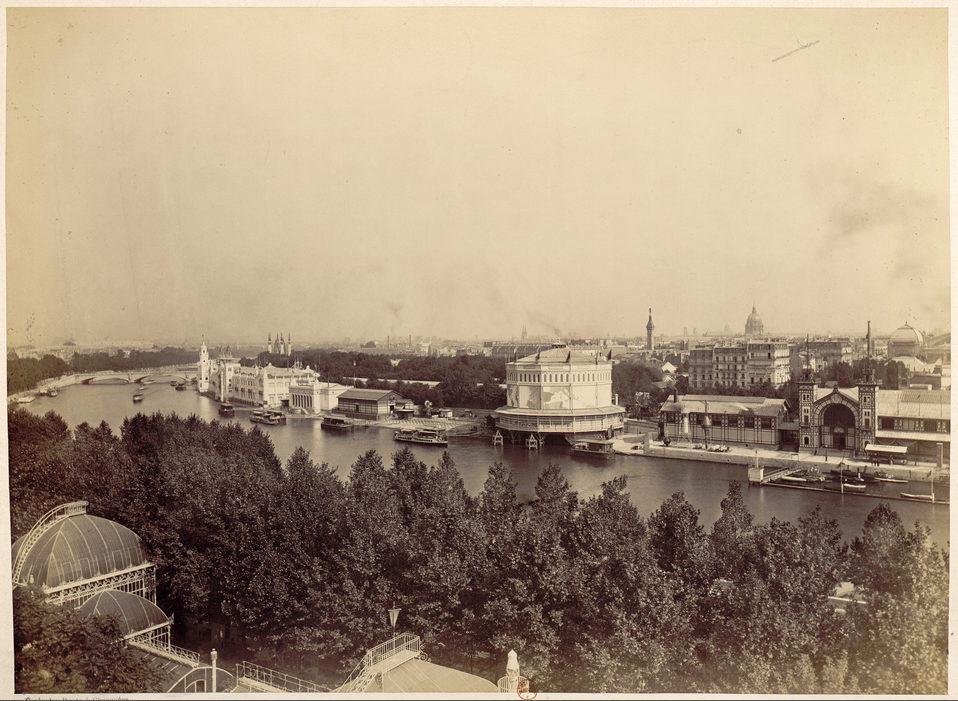 Exposition universelle de 1889: Pavillon des Travaux publics, vue générale vers l'amont