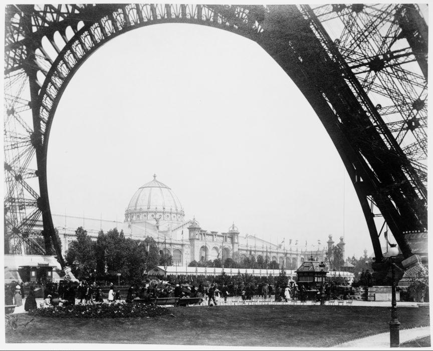 Exposition universelle de 1889: Palais des Beaux-Arts vu à travers la base de la Tour Eiffel