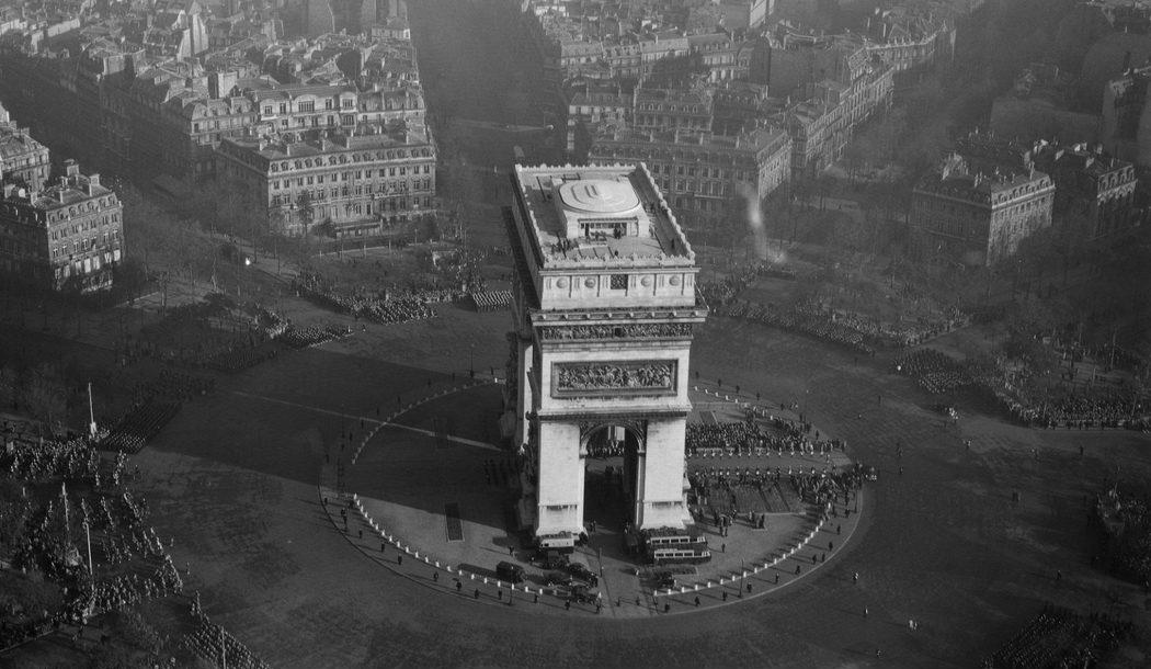 Vue aérienne de Paris : Défilé du 11 novembre 1951, la place de l'Etoile