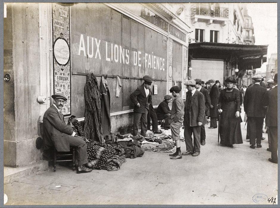 Etalage d'un fripier [Devant "Aux Lions de Faïence" fermé, 90 rue de Rivoli et 1, rue Nicolas Flamel]