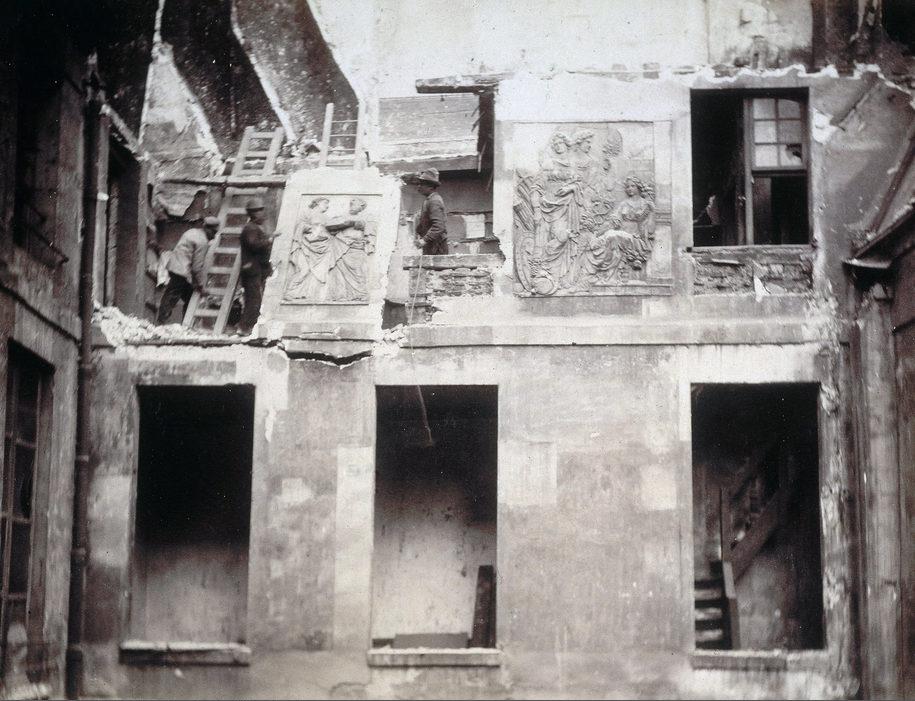 Hôtel Colbert: côté droit de la cour (au nord). Dépose des bas-reliefs de Thibaut Poissant