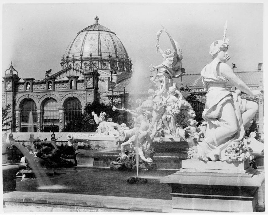 Exposition universelle de 1889: Fontaine Coutan et Palais des Beaux-Arts