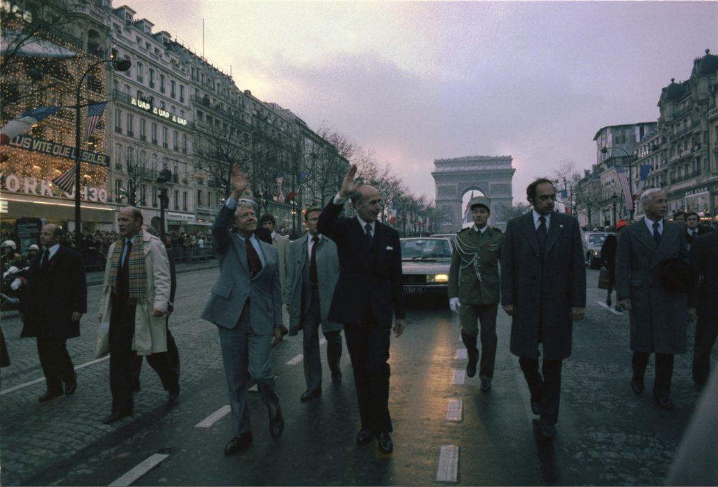 Jimmy Carter and President Giscard d'Estaing walk down the Champs-Elysees