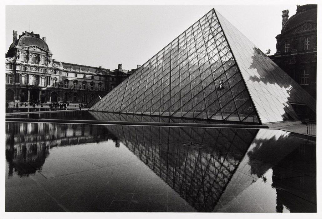 La pyramide du Louvre et deux laveurs de vitres, face aux pavillons Sully (gauche) et Denon (droite)