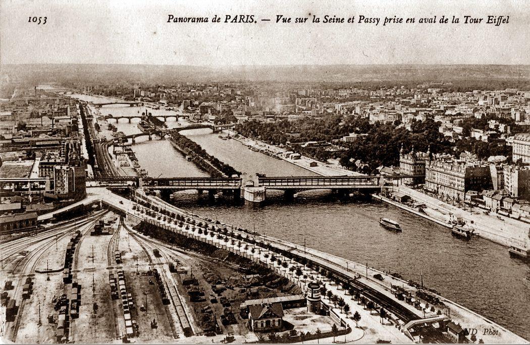 Panorama de Paris.  Vue sur la Seine et Passy prise en aval de la Tour Eiffel
