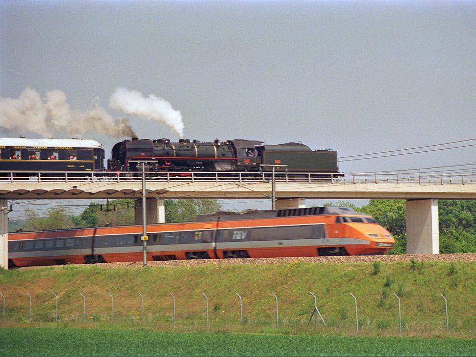 Croisement entre un TGV Sud-Est et un train à vapeur à proximité de Montereau