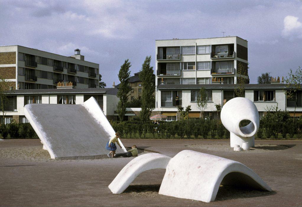 Enfants jouant sur une scultpture devant un immeuble HLM rue des Tournelles