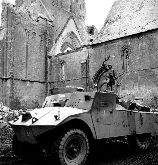 Une auto-mitrailleuse Morris devant l’église de Norrey-en-Bessin et son monument aux Morts