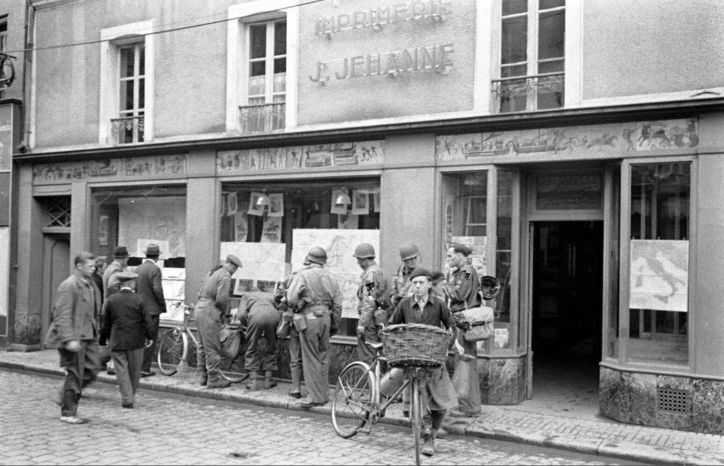 Bayeux, rue Saint-Malo devant la vitrine de l’imprimerie J.Jehanne