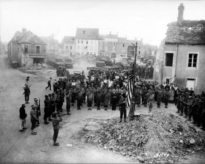Des civils et des soldats américains célèbrent le 4 juillet fête de l'Independence Day sur la grand' place de Trévières