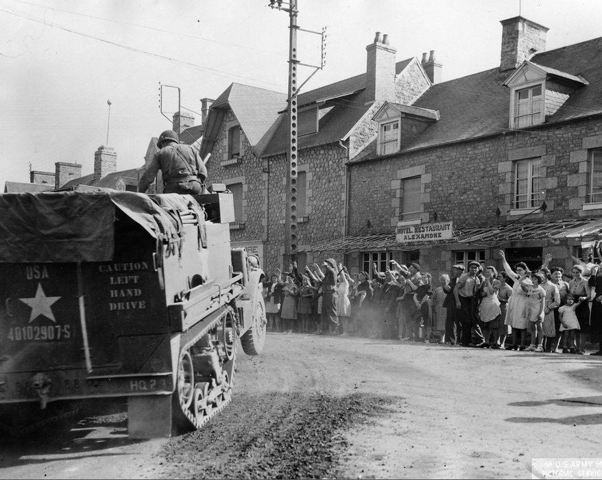 Sartilly, un half-track du CCB de la 6th US AD se dirige vers Avranches