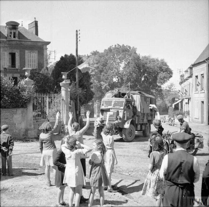 A Bedford QL 3-ton truck drives into Gacé