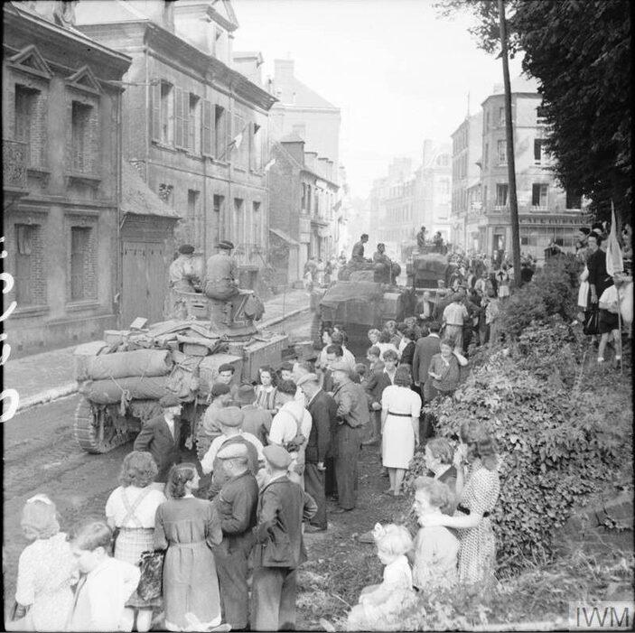 The inhabitants of Gacé line the streets as Stuart tanks enter their town